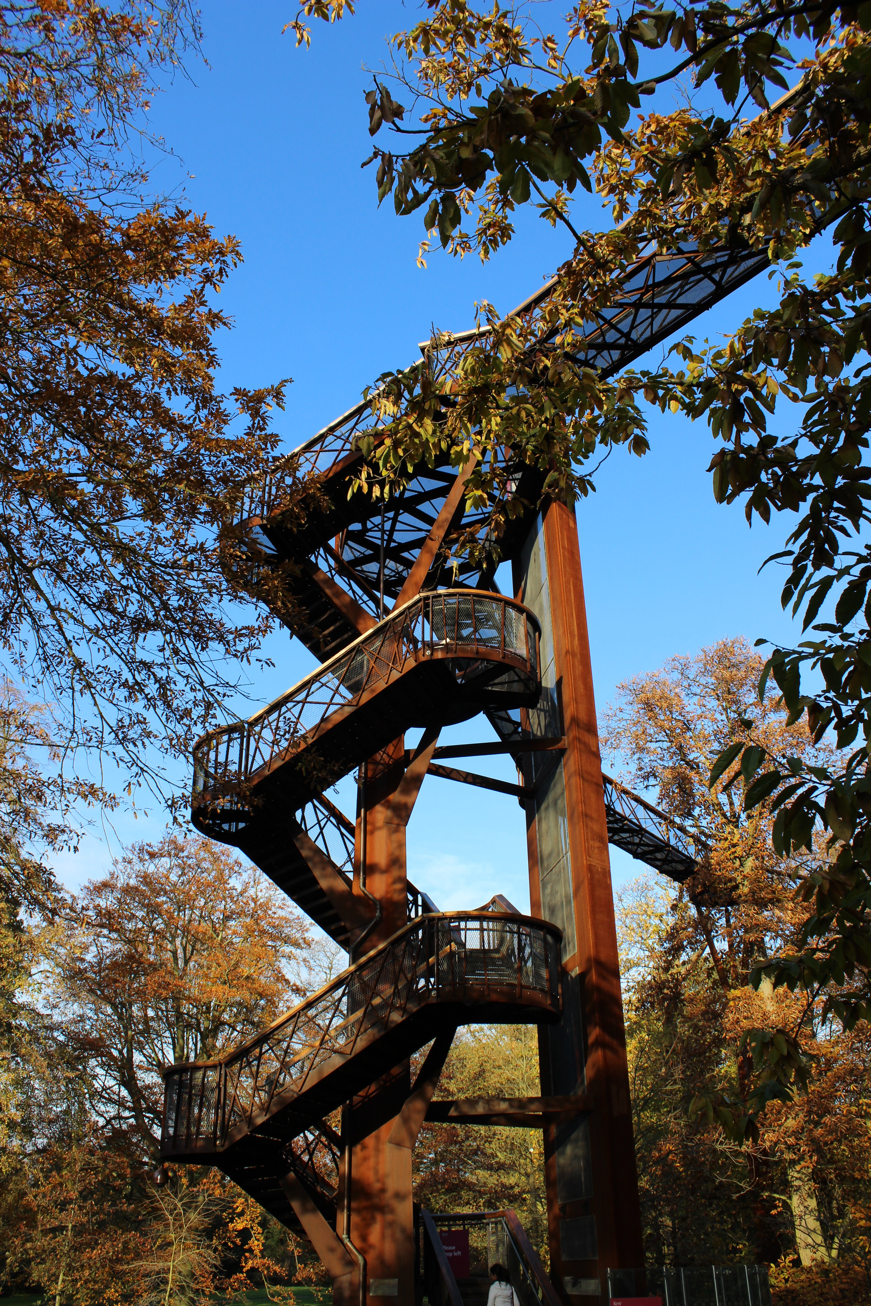 One of the things I was most excited about seeing at Kew Gardens was the Xstrata Treetop Walkway that was constructed a few years ago. The idea behind the walkway was to enable people to walk among the tree tops to get a closer look at the best part of the trees; the branches and leaves which aren’t usually easily accessible. Walking toward the structure it seems to appear suddenly from amongst the trees.