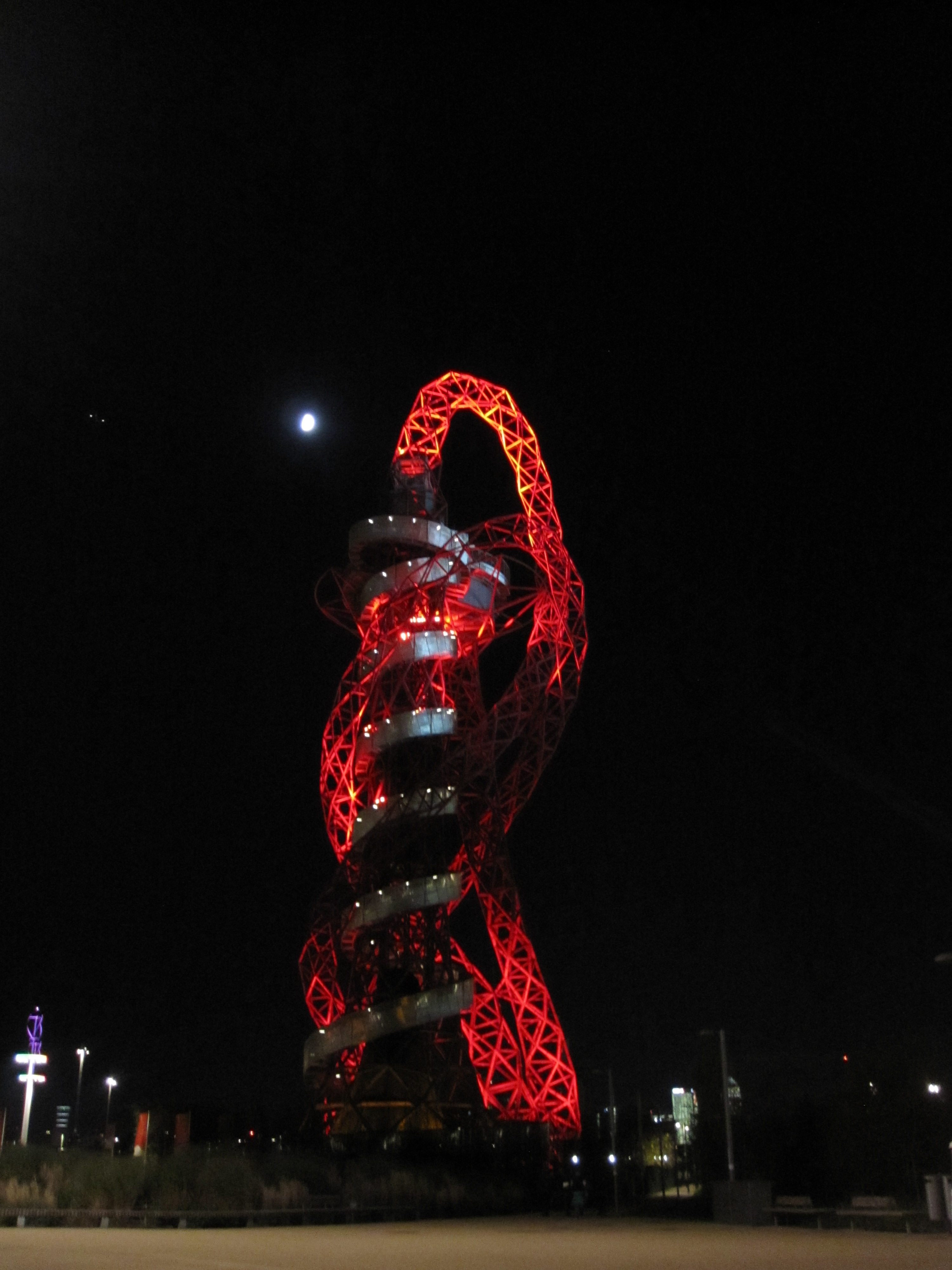 The ArcelorMittal Orbit at Stratford, London is the UK’s largest sculpture and observation tower. On a cold winter’s night the warm red glow under the bright moon makes it look like a welcoming fairground ride.